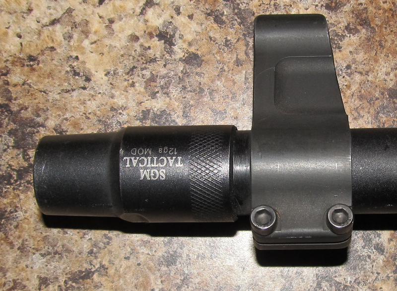 The Krebb’s Iron sights consist of the front post pictured above and a ghost ring rear that sits in the slot on top of the gas tube of the Saiga-12. Windage is zeroed by rotating the front sight right or left (locktite the screws in place) and adjusting the AR15 style front post. I have an XS big dot front sight in mine; its a natural fit for use on a shotgun.