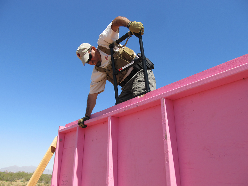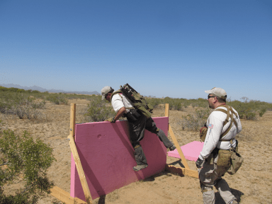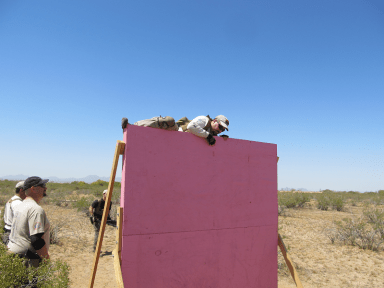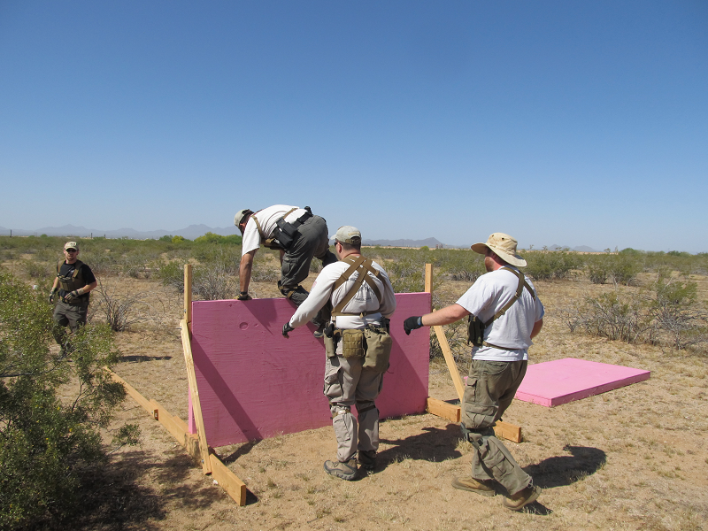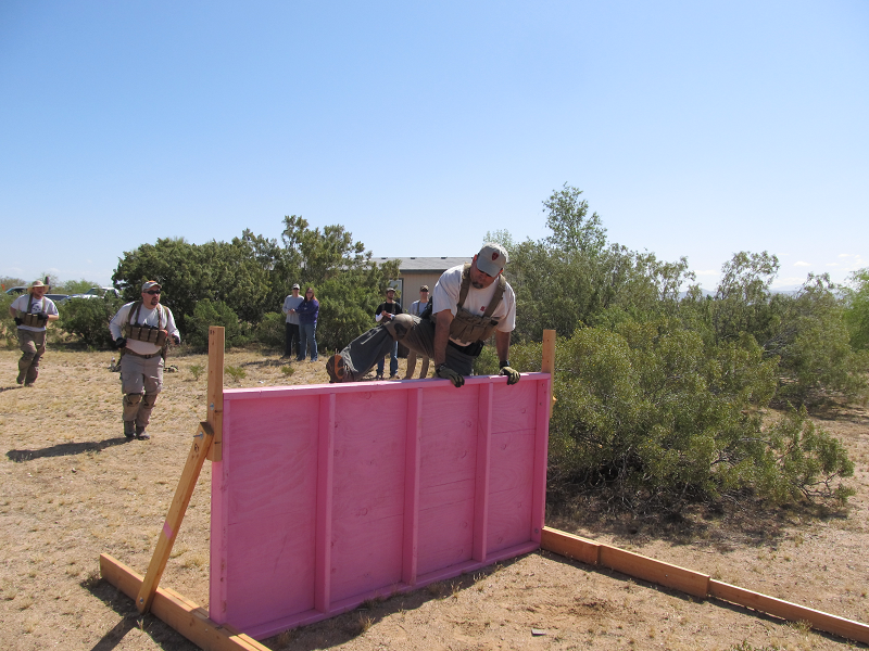 The Tiger Valley 4 Man Team Match is just a couple weeks away. The match features a number of obstacles and physical challenges, that are as important to complete as quickly as possible as the shooting. Negotiating the obstacles efficiently at the match has been our weakness for the past 3 years. In an effort to be better prepared for the match this year, the two Arizona teams pooled their resources and built a wall similar to the ones encountered at the match to practice going over.