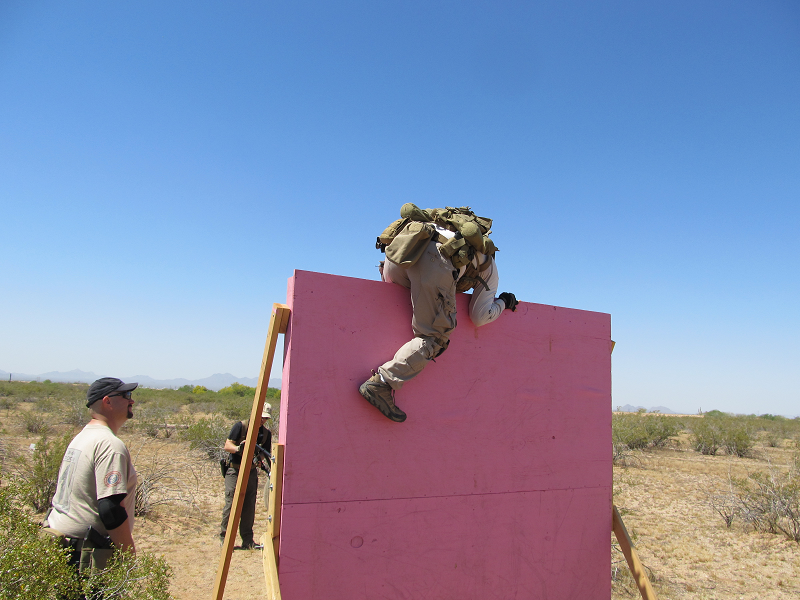 With the 8 foot wall assembled, Arizona B-Team man handles each other over it.