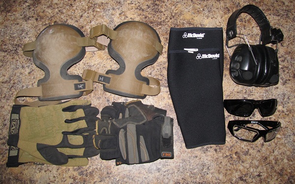Mechanix gloves with and without fingers. I use the fingerless gloves for most stages, unless I need to hold onto a rope or carry something abbrassive. Either way the amount of shooting at Ironman wears on your hands, and having gloves makes it easier to get into and out of pron positions faster. In particular wearing gloves makes shooting the Saiga-12 less painful with all the sharp edges on the AK design.