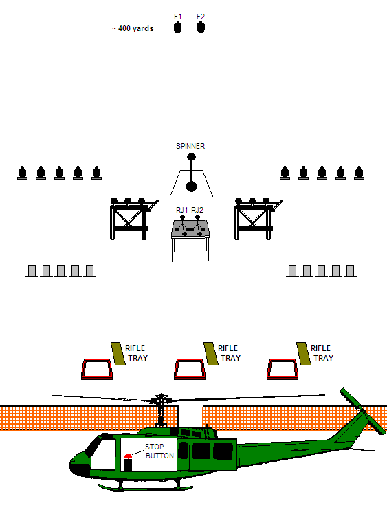 Start in the helicopter, rifles loaded/safe on trays at shooting boxes. On start signal, team will engage all targets; steel to fall, flashers to flash, spinner to spin 360 degrees, rifle jacks to walk off the table. Once targets have been engaged to the team’s satisfaction, the team must get back on board the helicopter before hitting the STOP button.