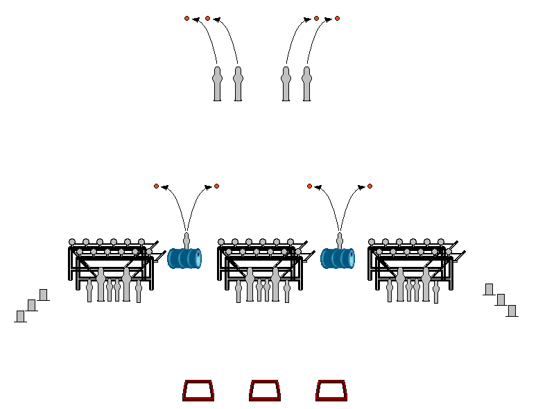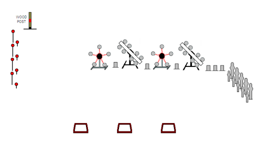 Start in the team corral, guns loaded and staged in respective containers. On start signal, the shotgunner will engage shotgun targets from shotgun shooting box and then tag the rifleman, then the rifleman will engage rifle targets from rifle shooting box and then tag the pistoleer, then the pistoleer will engage pistol targets from the pistol shooting box; shotgun steel to fall (buckshot or birdshot only), rifle steel to ring and rifle frangibles to break, pistol steel to fall.