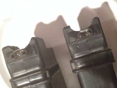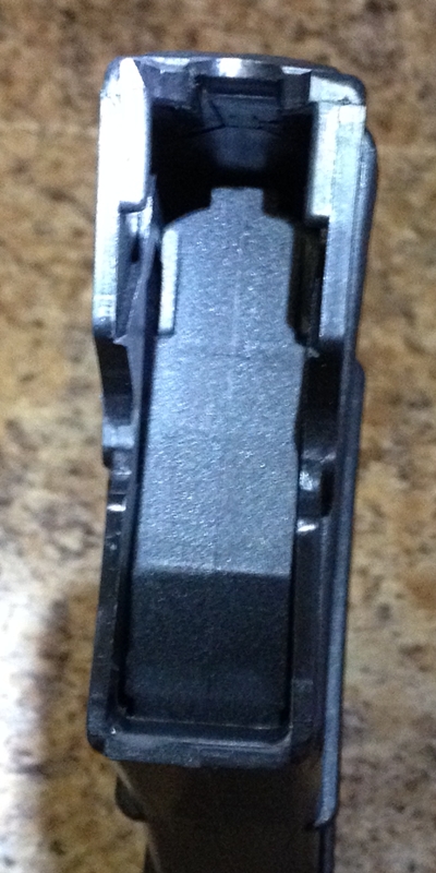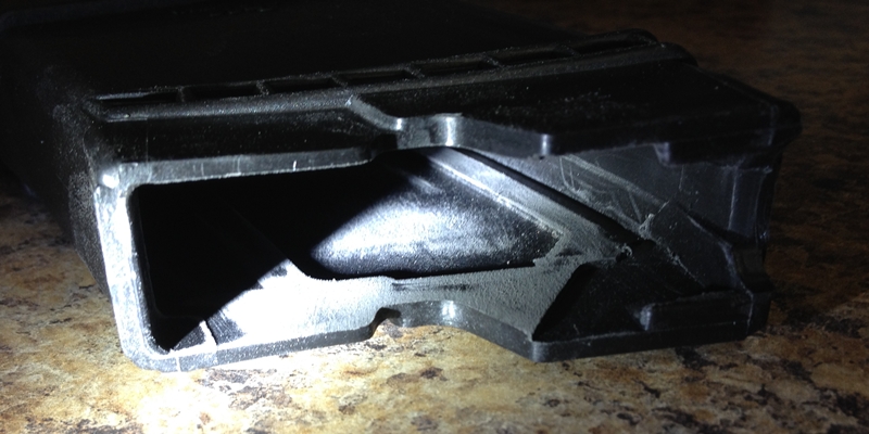 The reason for the follower/shell binding issues is readily apparent from simply looking at the magazine. The SGM magazines are a large injection molded part. The general principle of injection molding is that plastic is heated to melting point, then forced into a mold at high pressure. The part is then cooled in the mold for a short time, then ejected, and the process starts over again for the next part. The SGM magazines show signs of “sink” on the outside of the magazine body that correspond with the points where the shells and follower bind. There are a number of processing or mold design issues that can cause sink; either way SGM’s mold isn’t running right to produce parts.