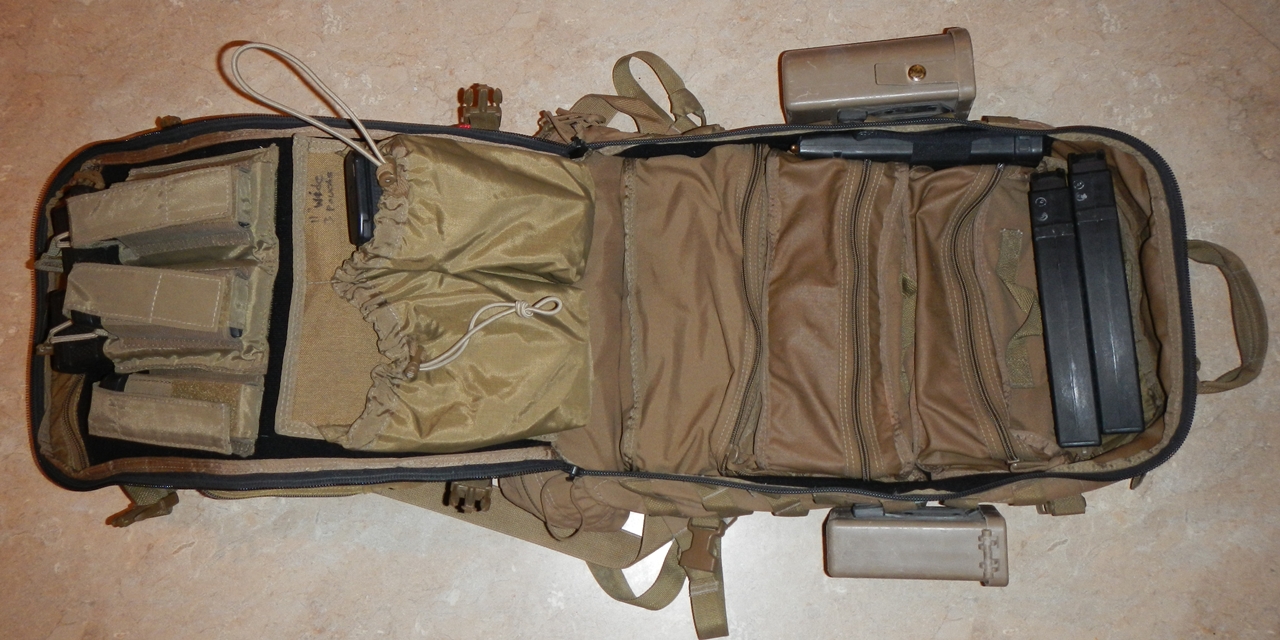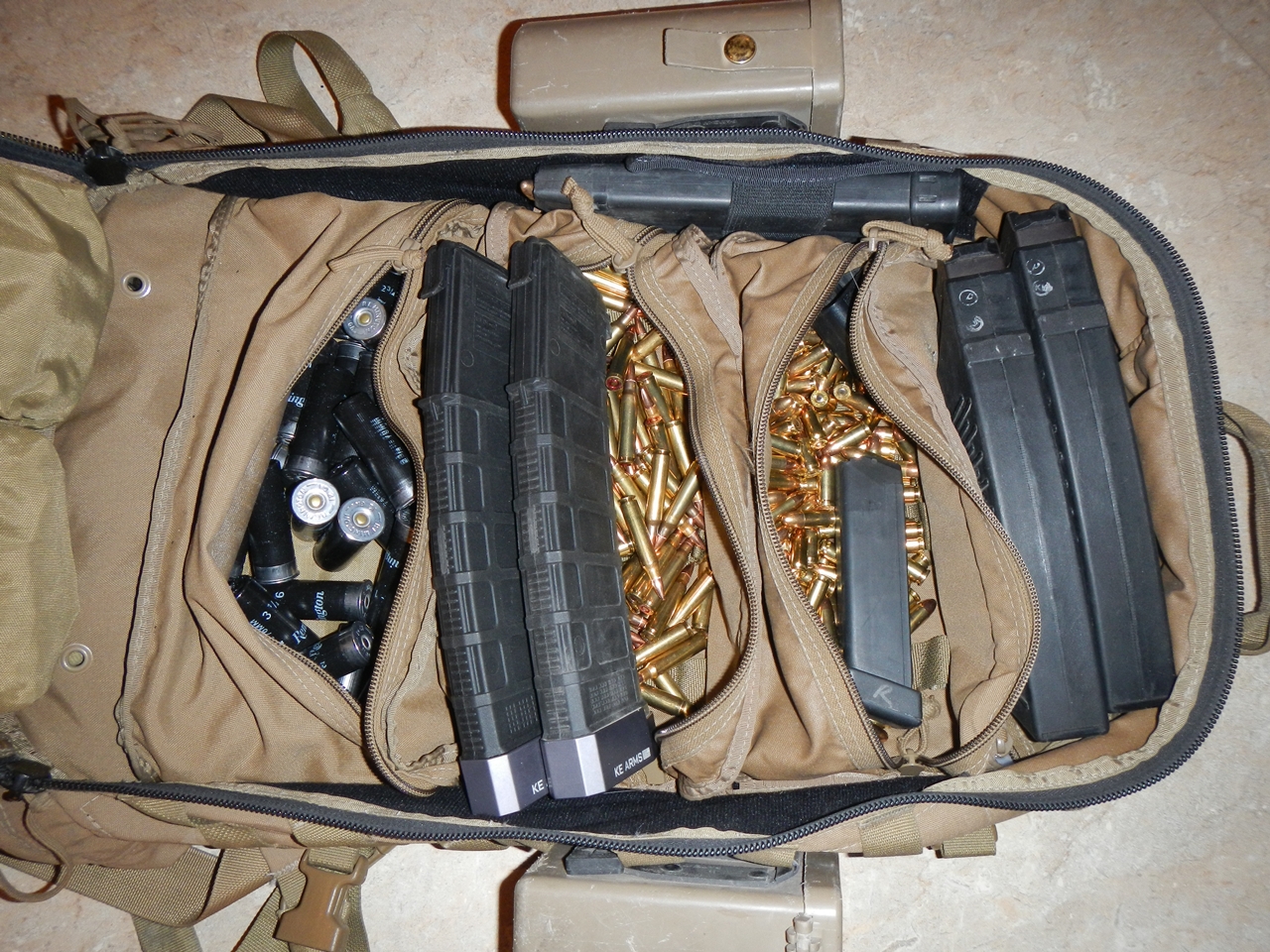 On the front face of the pack folded open I have Honor Point’s Rifle/Pistol mag combo pouches and a single pistol mag pouch. The bag style pouches with elastic cords I use for shotgun slugs and a coupled 30 round AR mags.
