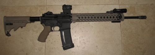 Home Defense/Trunk Gun doing double duty. 14.5″ Barrel with Permanent Flash Hider. Note 45 round magazine and Aimpoint M4S.