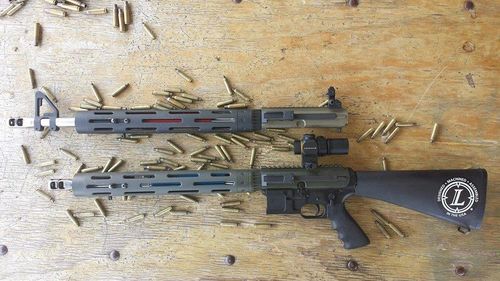 Dedicated Competition Rifles for Limited Division. Note on the Iron Sight upper the front sight base is as far forward as possible for maximum sight radius. The muzzle brakes are designed for optimal muzzle jump/recoil control without regard for noise level or flash. The optic is a Leupold Prismatic 1X.